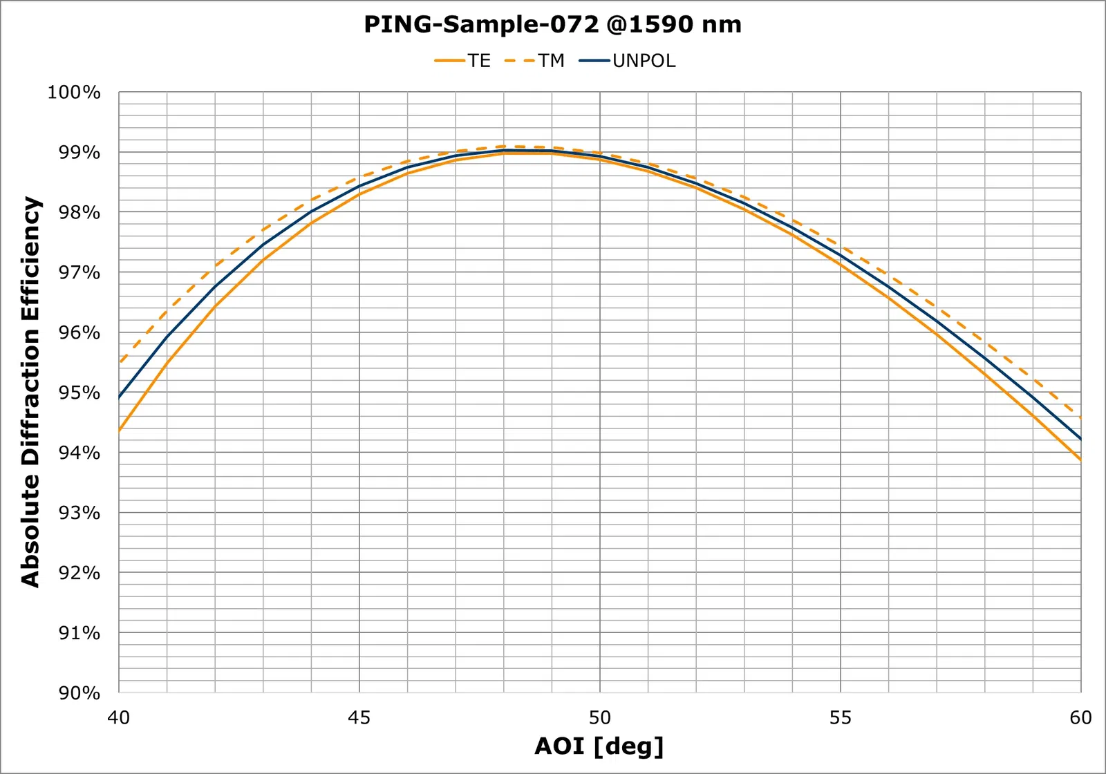 | Einfallswinkel | 48,5 Grad (nominal – siehe Diagramm unten, das eine hohe AOI-Toleranz zeigt) |