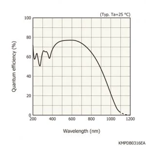 Another common way to state the sensitivity is in X amperes of photocurrent resulting from Y watts of incoming light. It can be a bit deceiving to look at a curve of the photosensitivity since it is easy to get the impression that this detector is far worse in the UV-region than the plot shown for quantum efficiency. However, one has to convert the photosensitivity to quantum efficiency to obtain a fair comparison.