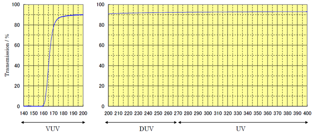 We make gratings for the entire transmission range of fused silica, which starts below 200 nm and goes beyond 2000 nm. The plot below show the UV applicability of UV grade fused silica material (and thus UV fused silica transmission gratings) – here shown as the external transmission (i.e. there is approx. 8% surface Fresnel reflection loss) of a 6.35 mm thick substrate.