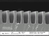 Ibsen fused silica transmission gratings are gratings that are structured directly into the surface of a fused silica substrate and comprise no other materials than fused silica. They are essentially a binary structure that is monolithically attached to the fused silica substrate. A SEM picture example of a typical grating is shown here: