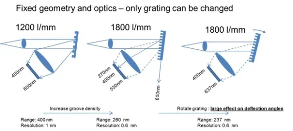 Figure 1: Example of reflection grating based spectrometer and the effect of changing the grating from a 1200 l/mm to an 1800 l/mm grating.