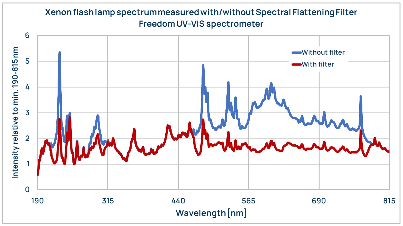 Achieving a flat spectrum with an exceptional signal-to-noise ratio is particularly challenging in broadband spectroscopy, such as UV-VIS and UV-NIR applications. At Ibsen Photonics, we effectively addressed this challenge by integrating customer tailored spectral flattening filters into our high throughput spectrometers. For example, we successfully flattened the xenon flashlamp spectrum measured with our FREEDOM UV-VIS spectrometer (as shown in the above image). This filter attenuated intense spectral peaks to match the lamp’s broadband intensity, ensuring superior signal-to-noise ratio across the entire measurement range. This demonstrates our commitment to providing tailored solutions and enhancing spectrometer performance.